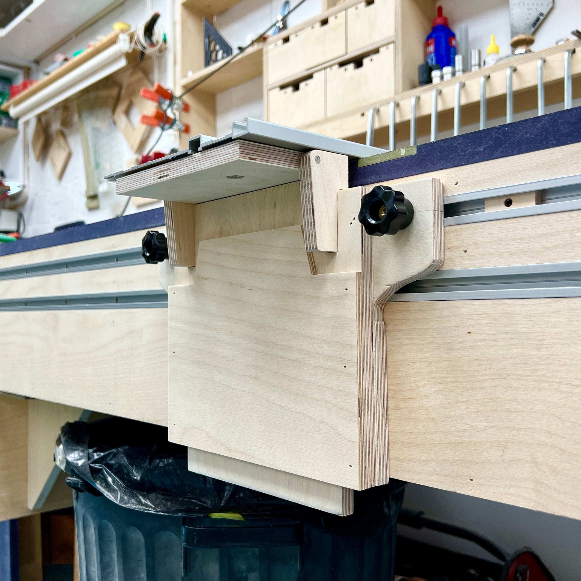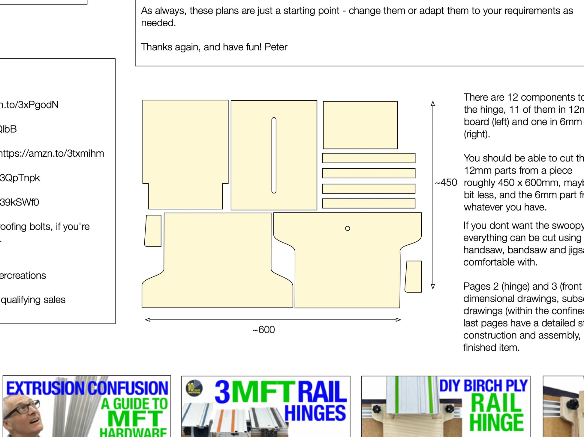 A rail hinge attaches to an MFT-style bench (see my other listings for those plans) and is a very convenient way to get the rail out of the way and your bench clear. Commercial rail hinges are usually costly (~£200 / $250) but this hinge can be made from around £12 / $15 of 12mm / 1/2” plywood - even at 2022 prices - and a little additional hardware; links to the hardware used are also provided.